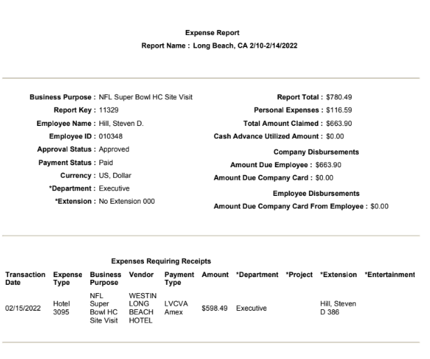 Meanwhile, Hill submitted this expense report. You’ll notice the report total was $780.49, with Hill covering $116.59 in personal expenses.