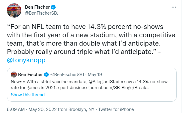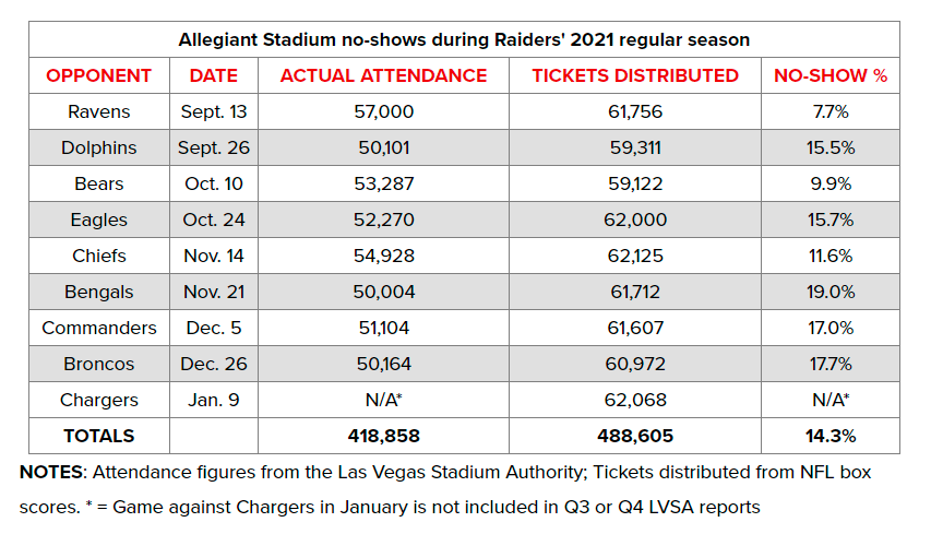 My friends at the Sports Business Journal did some nice work showing the difference between the tickets distributed for a Raiders home game at the stadium and the actual attendance, which is you actual numbers of people going through the turnstiles and present at the game. A no-show rate of 14.3 percent for the Raiders home season is rather high. Here’s the work of SBJ’s Ben Fischer showing the game-by-game actual attendance and tickets distributed.