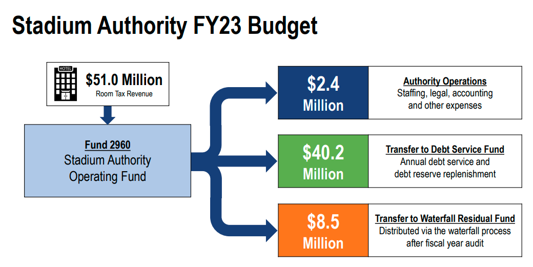 The public stadium authority plans on using $40.2 million under the 2023 fiscal year budget to help pay off the annual debt service on the public’s $750 million contribution toward building the domed stadium. It’s interesting to note that the stadium authority has budgeted $2.4 million in staffing, legal and accounting expenses. In all, the public stadium panel is planning on collecting $51 million in hotel room tax dollars for the 2023 fiscal year.