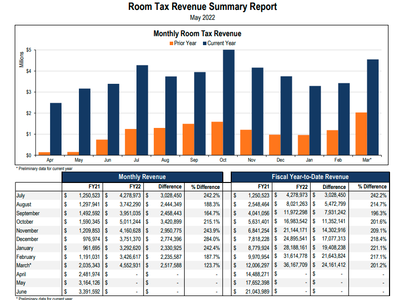 As you can tell by the monthly bar chart numbers, the hotel room tax dollars are rebounding over last year’s monthly numbers. In March, for example, the hotels in Southern Nevada collected $4.5 million in room tax money — more than double the number from March 2021.