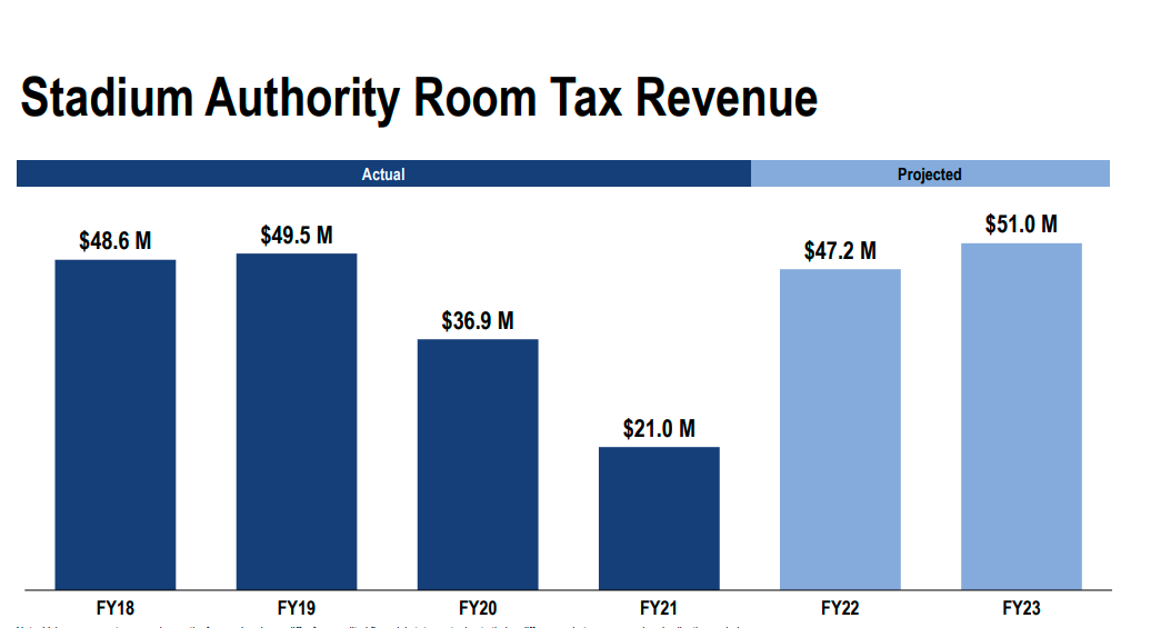 Take a look at the projected stadium authority room tax revenues for fiscal year 2022 and 2023. The $51 million in projected room tax money for next year would be more than the previous high of $49.5 million of fiscal year 2019.