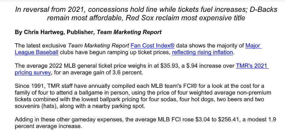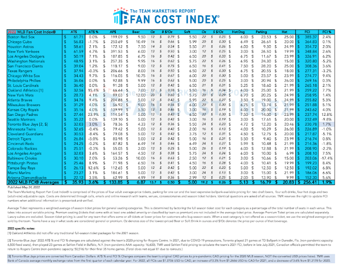 Here’s the 2022 FCI for Major League Baseball. You’ll notice that the Red Sox, Cubs, Astros, Yankees and Dodgers are the top five most expensive for a family of four, with the Athletics’ $259.22 coming in number 12 out of MLB’s 30 teams. The average family of four cost in the 2022 MLB Fan Cost Index was $256.41, so the Athletics’ family of four costs was about three bucks more than the MLB average.
