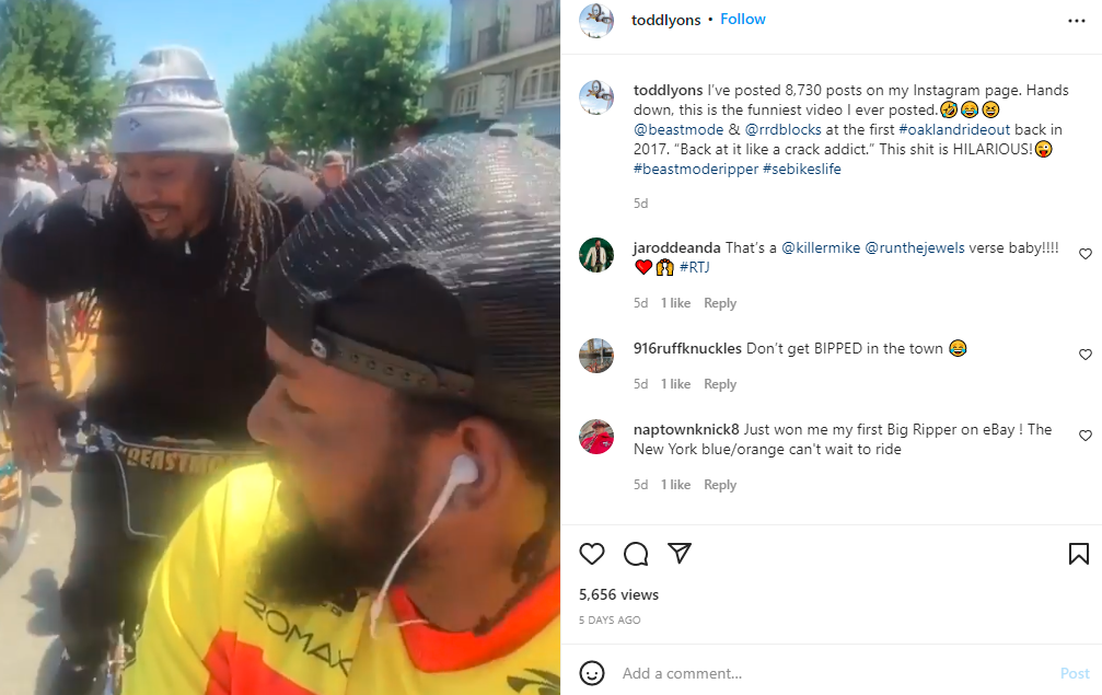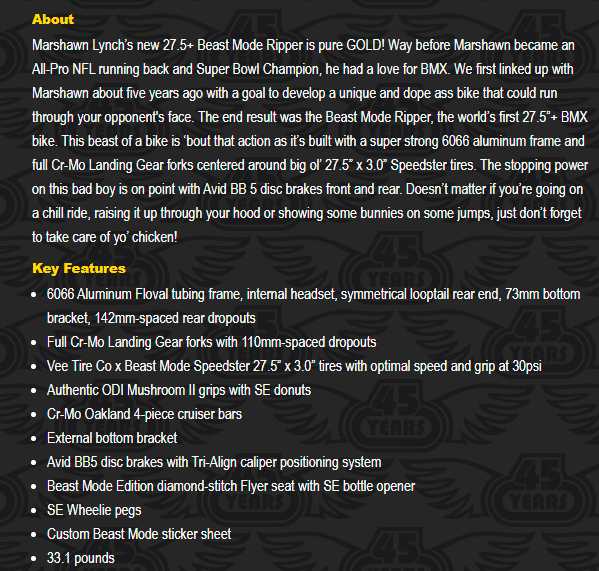 SE Bikes, which makes the Beast Mode Ripper, posted a photo of Lynch riding the supersized BMX bike in a recent bike ride and noted this on its website: “We first linked up with Marshawn about five years ago with a goal to develop a unique and dope ass bike that could run through your opponent’s face. The end result was the Beast Mode Ripper, the world’s first 27.5”+ BMX bike.”