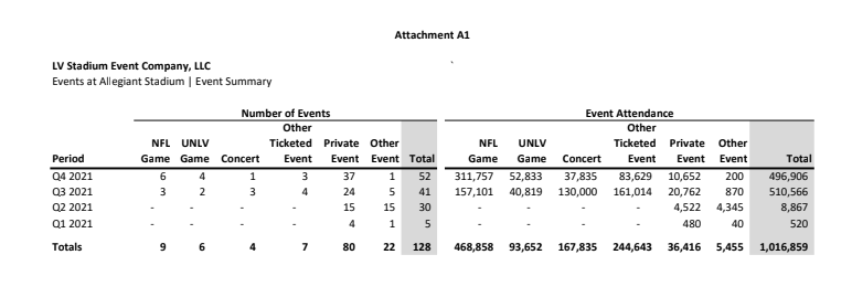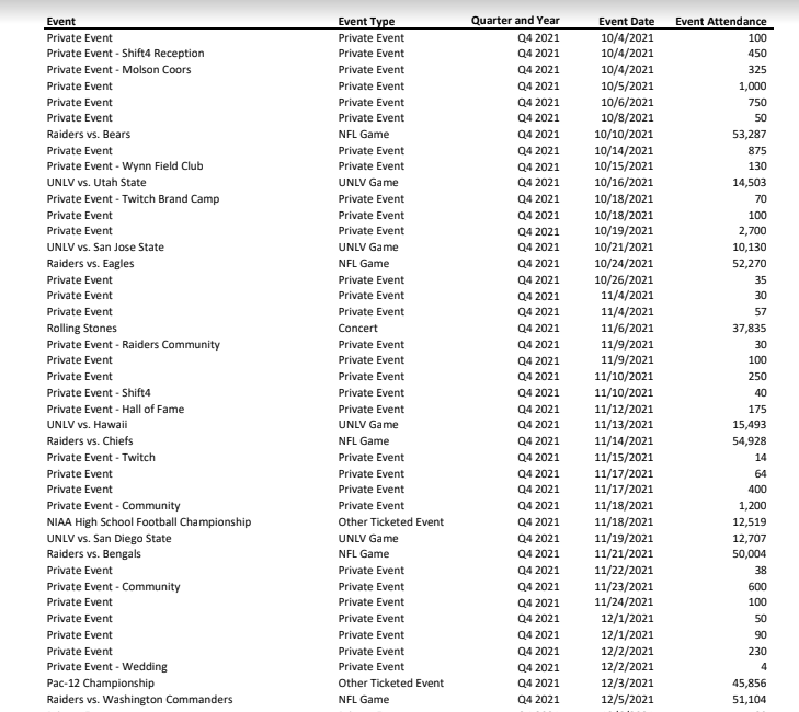The Raiders games’ total of 468,858 was less than half of the total of 1,016,859 people in the stadium in 2021. That 1 million+ includes private events of 36,416 people and other events of 5,455 people.
