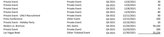 There were nine Raiders games and six UNLV football games. That’s 15 events. Then, add four concerts and you have 19. And then layer seven other ticketed events and the total number of Raiders/UNLV football games, concerts and other ticketed events hits 26.