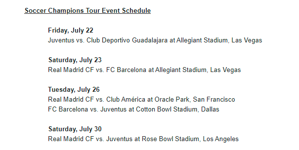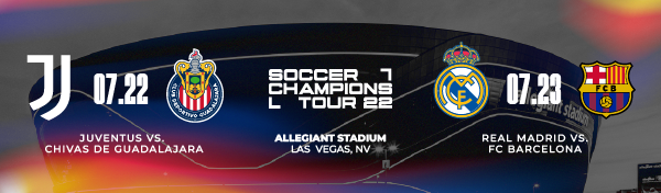 The two soccer games at Allegiant Stadium are Juventus vs Club Deportivo Guadalajara on July 22 and Real Madrid vs FC Barcelona on July 23.