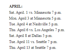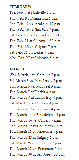 ^ Then following the homestand, Vegas will play a season-high six consecutive games on the road beginning in Arizona on Jan. 22 and concluding on Feb. 9 in Minnesota.