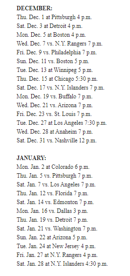 ^ The Knights will have a season-high, six-game homestand begin on January 7 when hosting Los Angeles at T-Mobile Arena, and continue against Florida (1/12), Edmonton (1/14), Dallas (1/16), Detroit (1/19), and Washington (1/21).