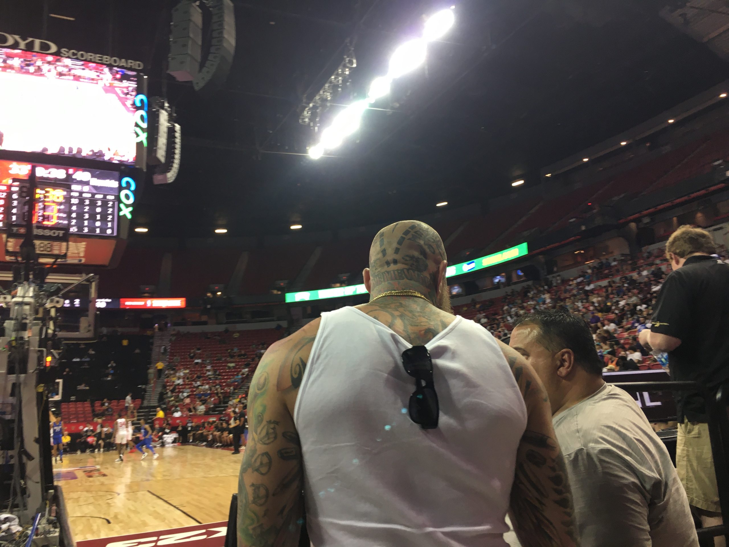 LVSportsBiz.com even bumped into the colorful “Birdman” himself, Chris Andersen, the former six-foot, ten-inch NBA player known for his tattoos. Here he is catching a Bulls-Mavericks game from behind one of the goals.