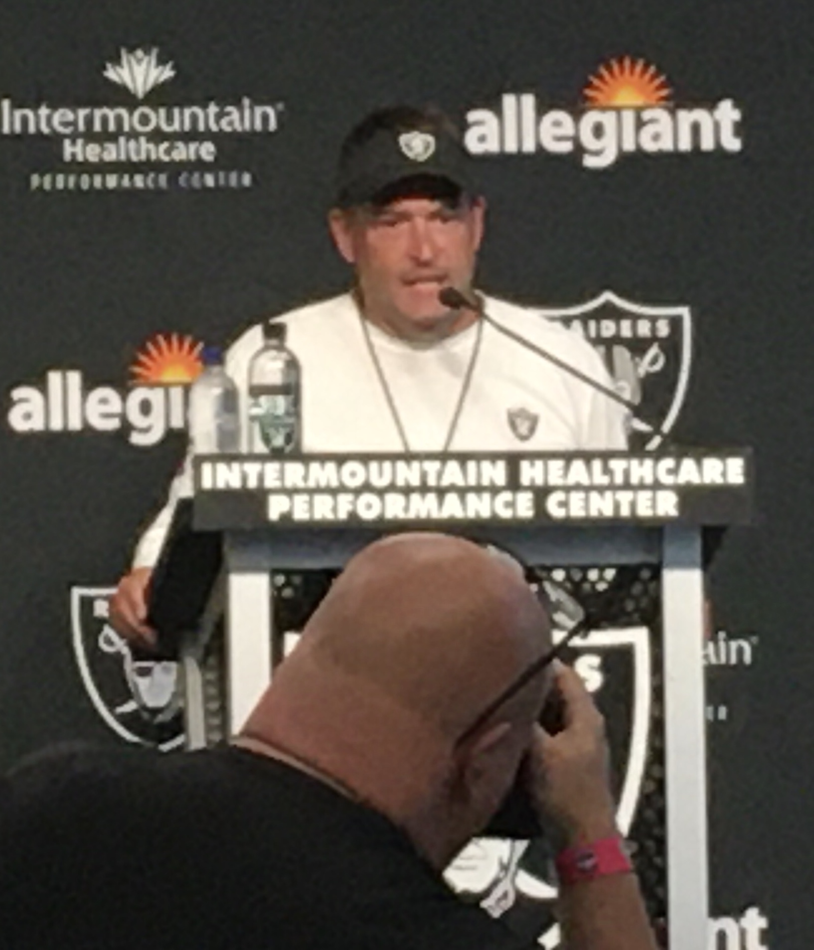 The Raiders brought in three coaches and a coach to talk to the media in a room on the side of the team HQ building. The media tosses out questions to the players and coaches like special teams coach Tom McMahon who came visiting today.