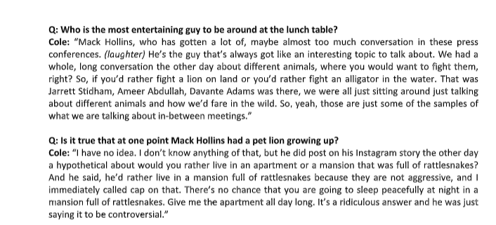 Then came punter/funnyman AJ Cole, one of the league’s premier punters and a free-spirited talker who joked about everything from him looking more and more like placekicker Daniel Carlson to Mack Hollins’ goofy statements.
