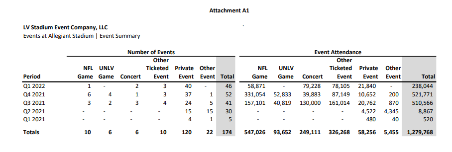 You’ll notice the lion’s share of the activities are “private events” where the stadium is used pretty much as a catering hall for organizations and groups. For example, for Q1 of 2022, the Raiders listed 46 total events but 40 of them were private events.
