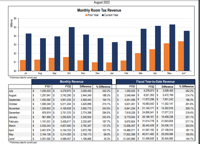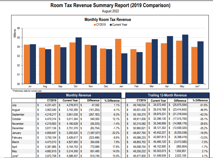 Take a look at the hotel room tax revenues that are piling up this year. They far exceed the numbers of 2021 and are back to the pre-pandemic numbers of 2019. In March, April, May and June, the hotel bed money this year outdistanced the numbers for the same months in 2019. In the past 12 months, the stadium’s hotel room tax dollars have totaled anywhere from $3.3 million a month to $5.3 million a month.