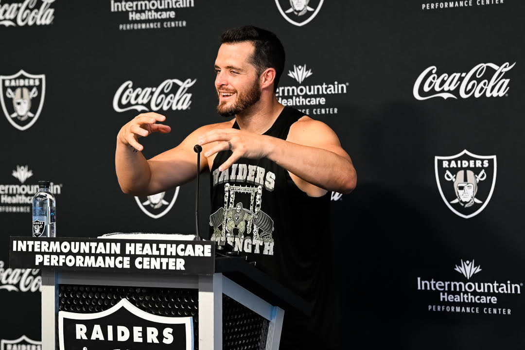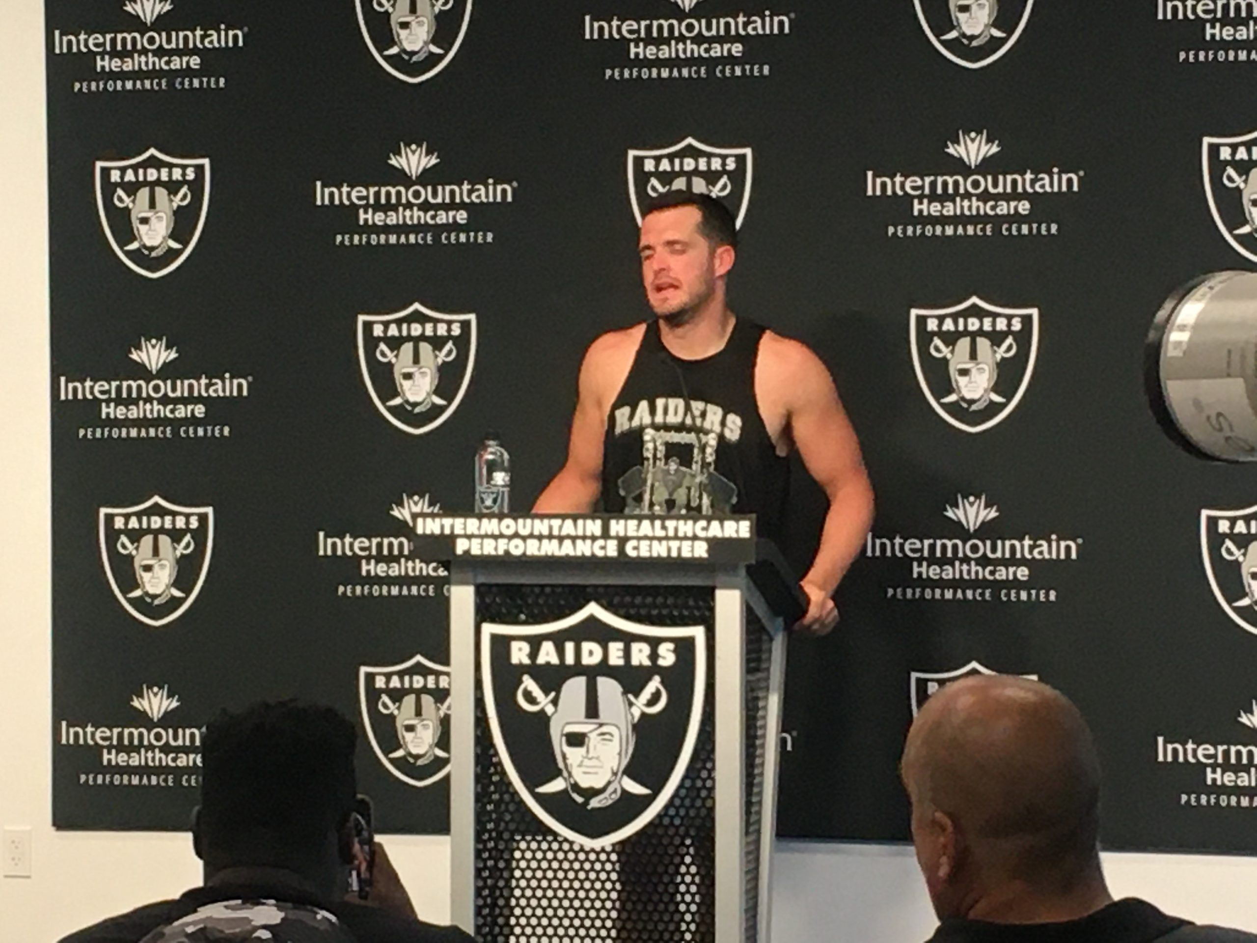 Raiders quarterback Derek Carr is scheduled to meet the press later Tuesday morning. He’s a chatterbox up at the lectern so stay tuned for a few comments later. Here’s a LVSportsBiz.com photo from a previous Carr appearance in the media room during training camp in Henderson.