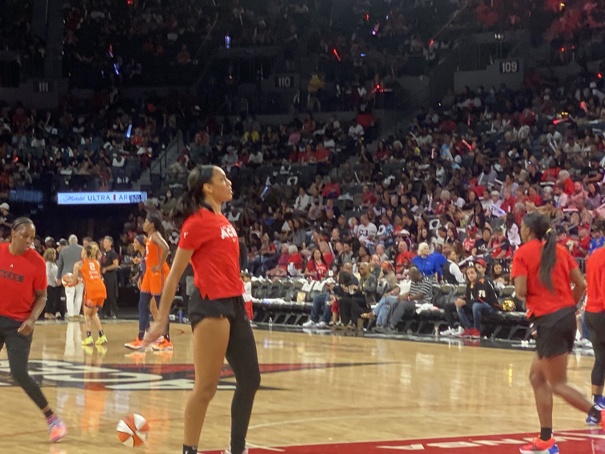 A’ja Wilson warms up for third quarter.