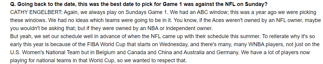 Why did the WNBA have its Finals Game 1 against the NFL’s first Sunday of games? Here is WNBA Commissioner Cathy Engelbert’s explanation: