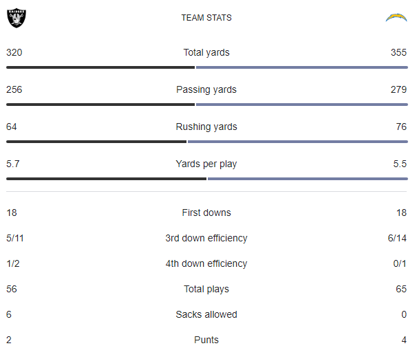 But with the Raiders trailing by five points with less than four minutes left in the game in LA Sunday, quarterback Derek Carr could not mount the winning drive. He was sacked on the last two Raiders plays and Los Angeles converted a first down to seal the win.