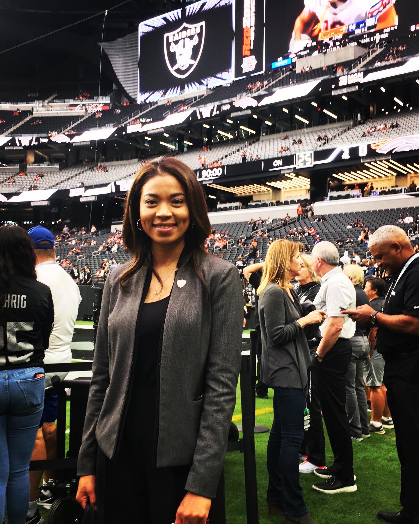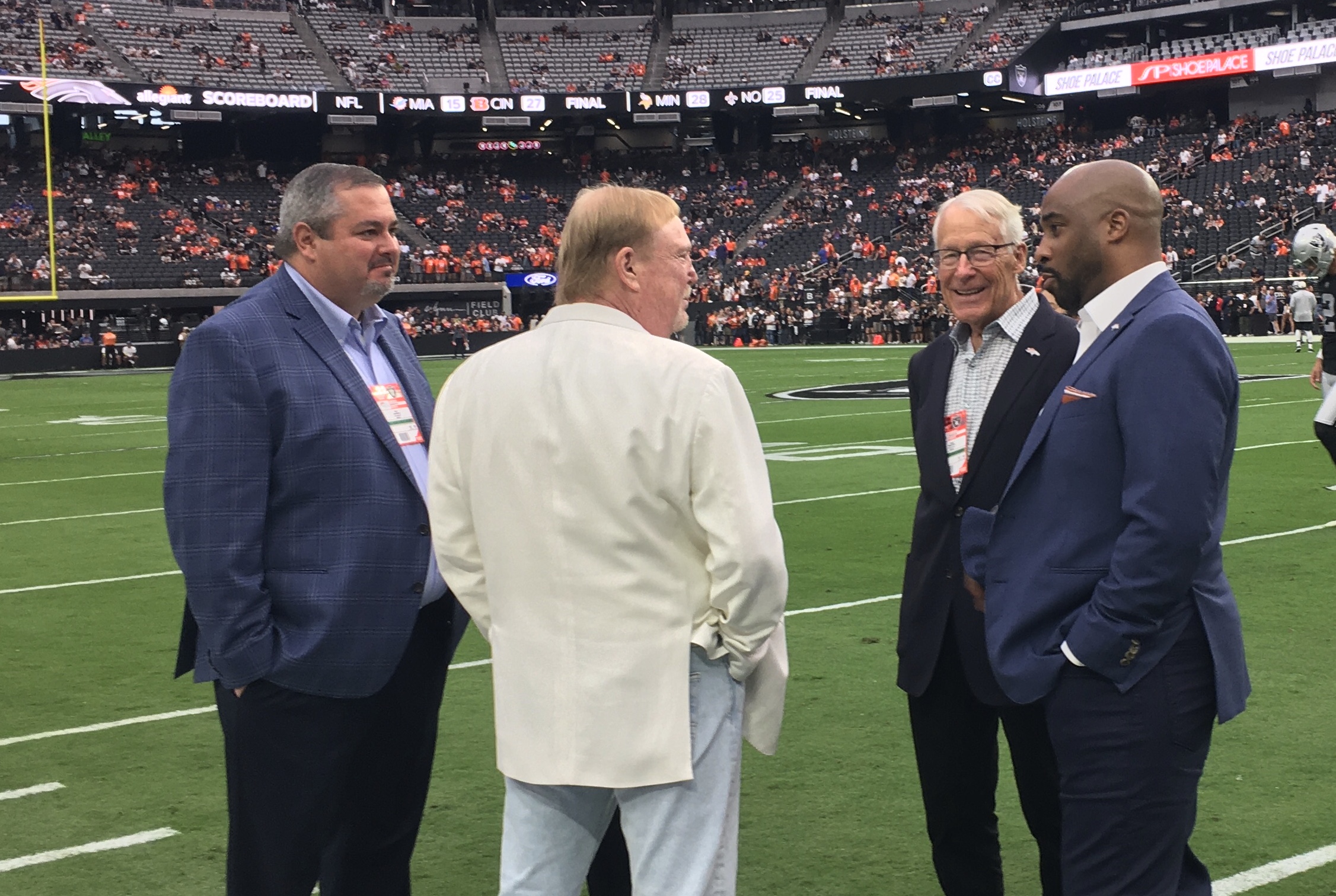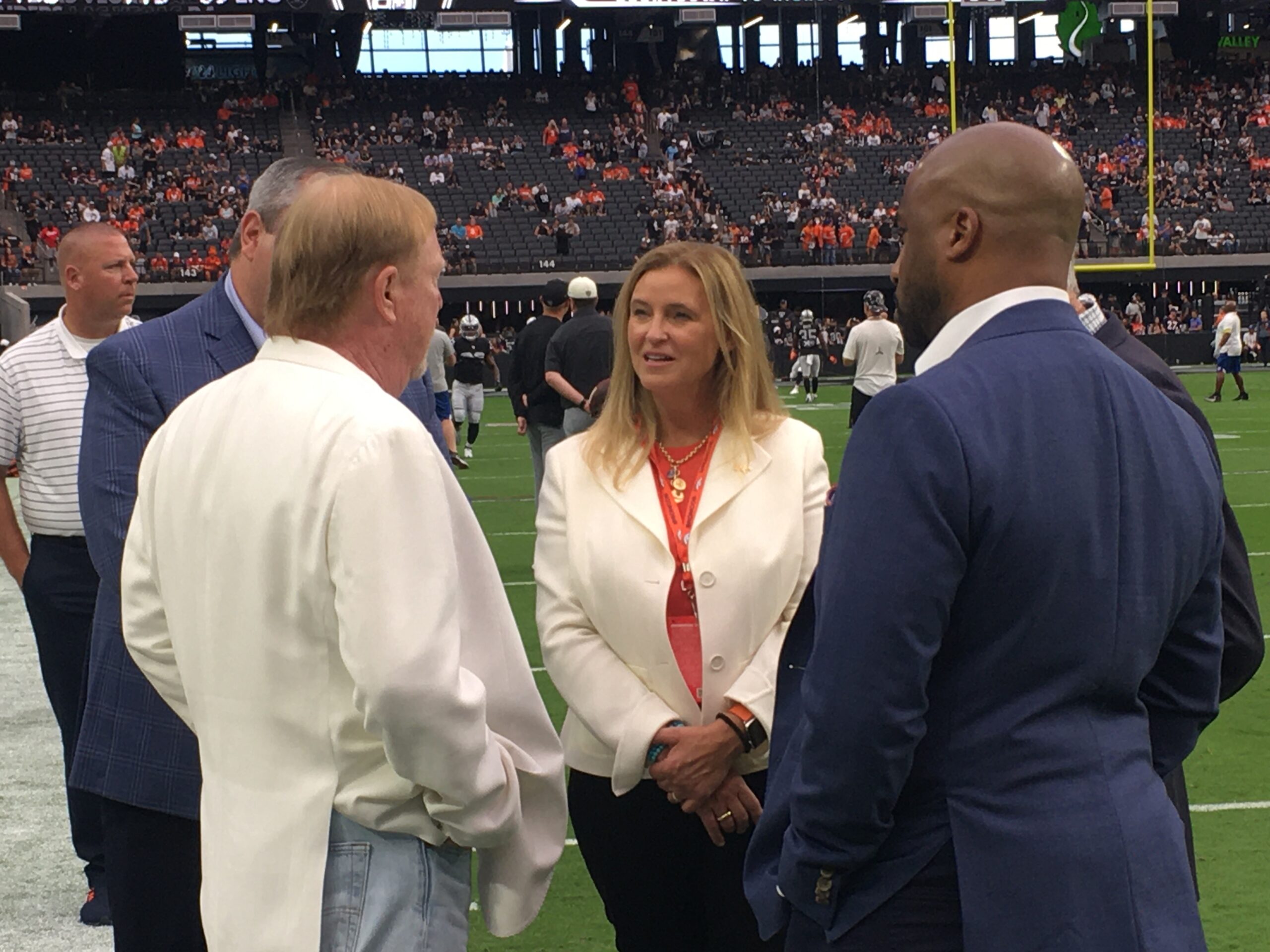 In fact, the Broncos president, Damani Leech, and general counsel Tim Aragon joined the Waltons in meeting up with Davis on the Raiders side of the field.