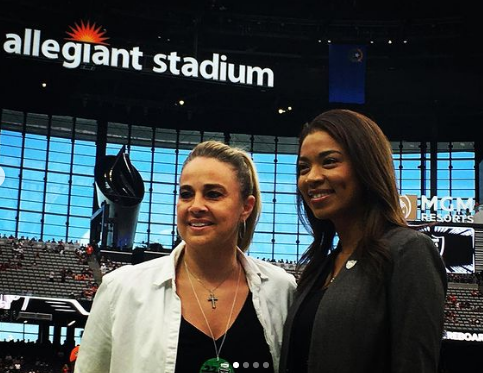 To get the game going, Aces head coach Becky Hammon and her crew lit the Al Davis torch. Here’s Hammon with Raiders team president Sandra Douglass Morgan before the game.