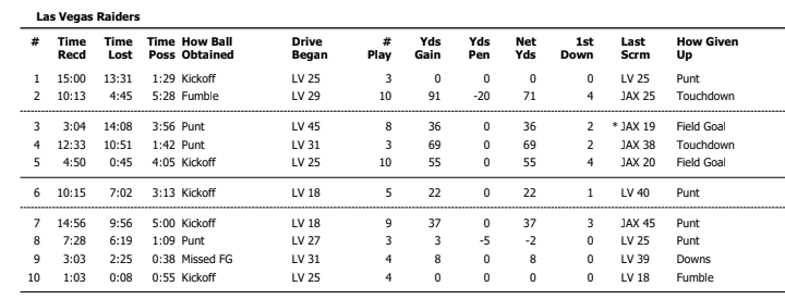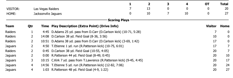 The Raiders lost to the Jacksonville Jaguars Sunday by a score of 27-20 after the Raiders enjoyed a 17-0 lead in the second quarter. Here’s how the score went from a Raiders lead to a Jacksonville win: