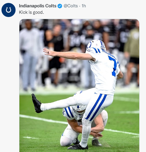 The Colts moved the ball nicely down the field on the Raiders defensive after taking the second half kickoff. Colts runner Jonathan Taylor was picking up yardage effectively, but on a third-and-one the Colts chose to pass and it backfired on them. Raiders defensive end Maxx Crosby sacked Ryan and McLaughlin came on for yet another 48-yard FG attempt. The kick caromed off the upright and the Raiders still trailed by six.