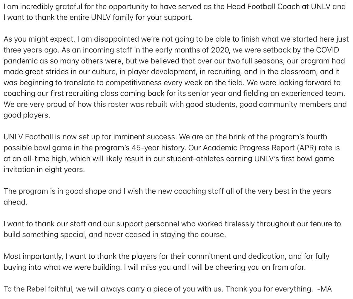 The UNLV football program had high expectations because of the money invested in renting Allegiant Stadium for its games and being based in an impressive headquarters facility. While UNLV football is not a top brand in college football, it could be an attractive job for a football coach in light of the impressive game and practice facilities and the improved status of Las Vegas as a major sports market in the U.S.