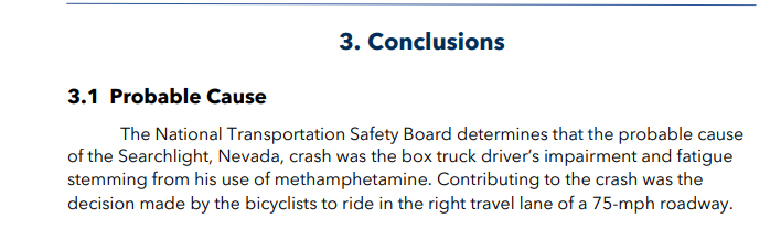 There you have it on page 14 of the federal transportation report: “Contributing to the crash was the decision made by the bicyclists to ride in the right travel lane of a 75-mph roadway.” In other words, the federal government is blaming the victims for riding bicycles on a road.