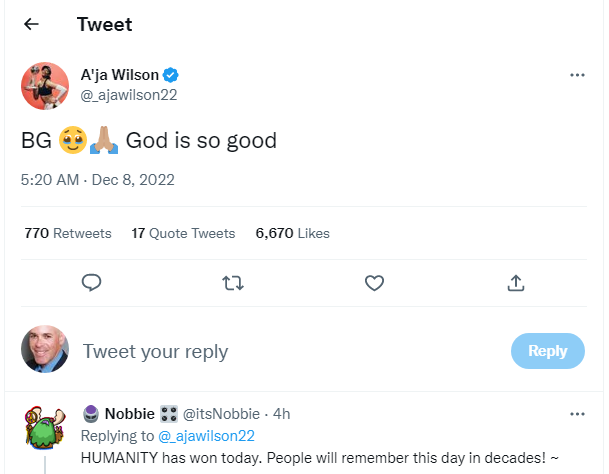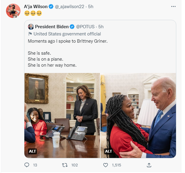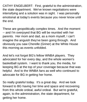 “There has not been a day over the past ten months where we all haven’t had Brittney Griner on our minds and in our hearts and that has now turned into a collective wave of joy and relief knowing that she will soon be reunited with her family, the WNBA player community, and her friends. BG has shown extraordinary courage and dignity in the face of enormous adversity. The WNBA is grateful beyond measure to the Biden Administration, the Special Presidential Envoy for Hostage Affairs, and all those who played a role in bringing BG home today. Our hope is that Paul Whelan and every wrongfully detained American will be returned home safely and as soon as possible.”