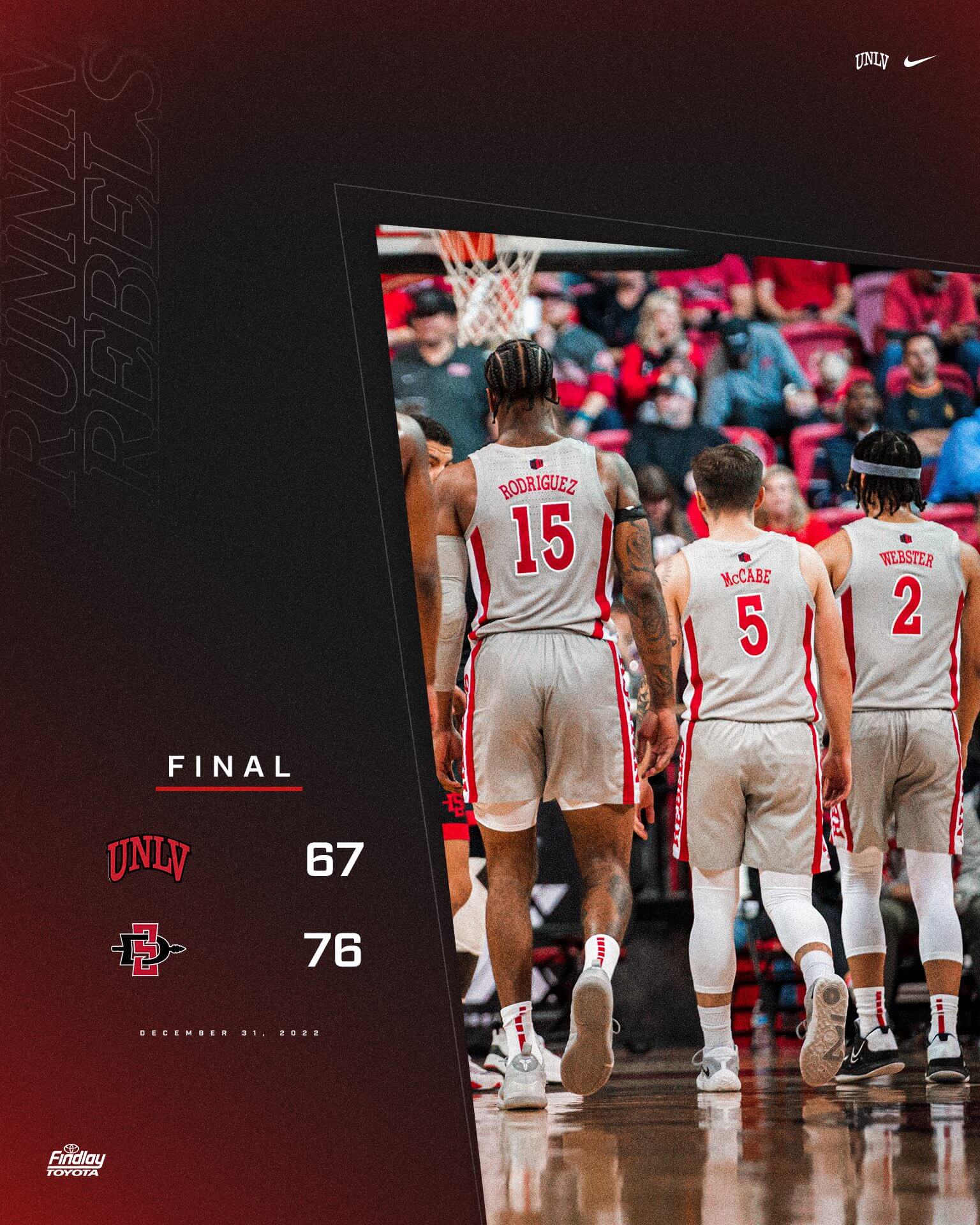 UNLV lost its second straight conference game, and three of its last four games, as San Diego State outlasted the Rebs, 76-67, at Thomas & Mack Center on New Year’s Eve day.