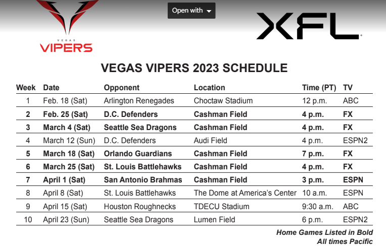 Here’s the Vipers schedule released Thursday: