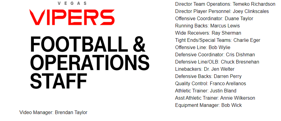 The Vipers coach is former NFL player Rod Woodson. And here’s the Vipers staff:
