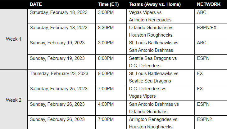 The XFL season begins in February after the Super Bowl and here’s a look at the first two weeks of the schedule.