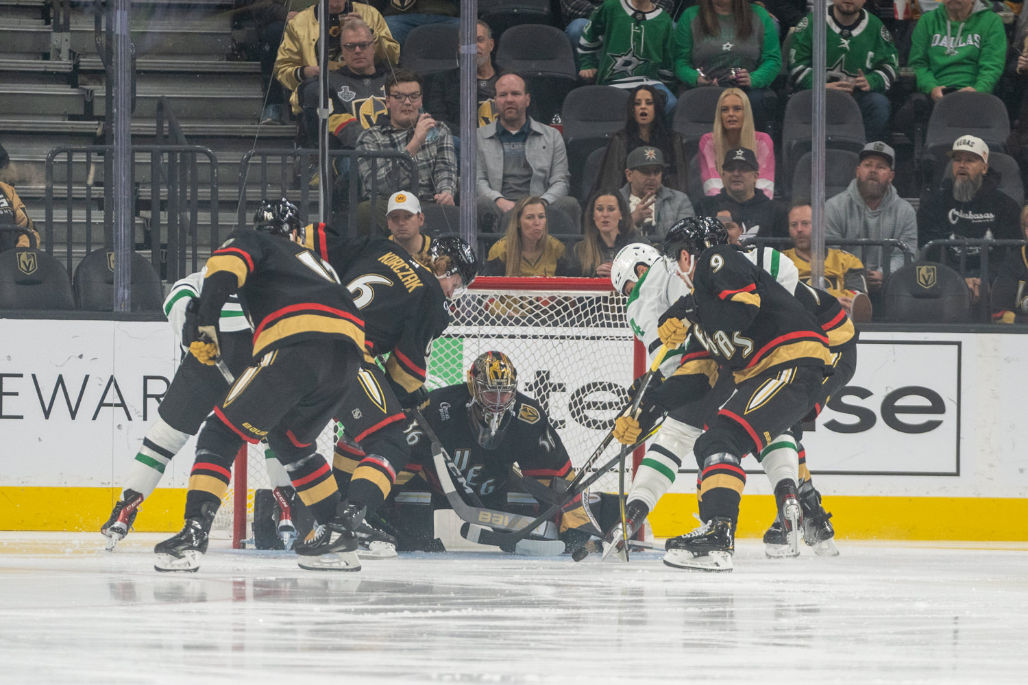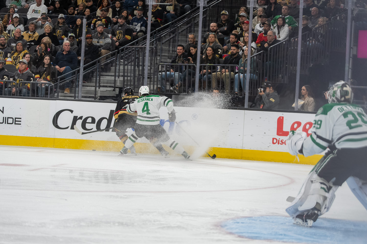 With just over 12 minutes left in period three, Dallas defenseman Ryan Suter wristed the puck toward the net and the puck beat VGK goalie Logan Thompson. It gave Dallas a 3-0 lead.