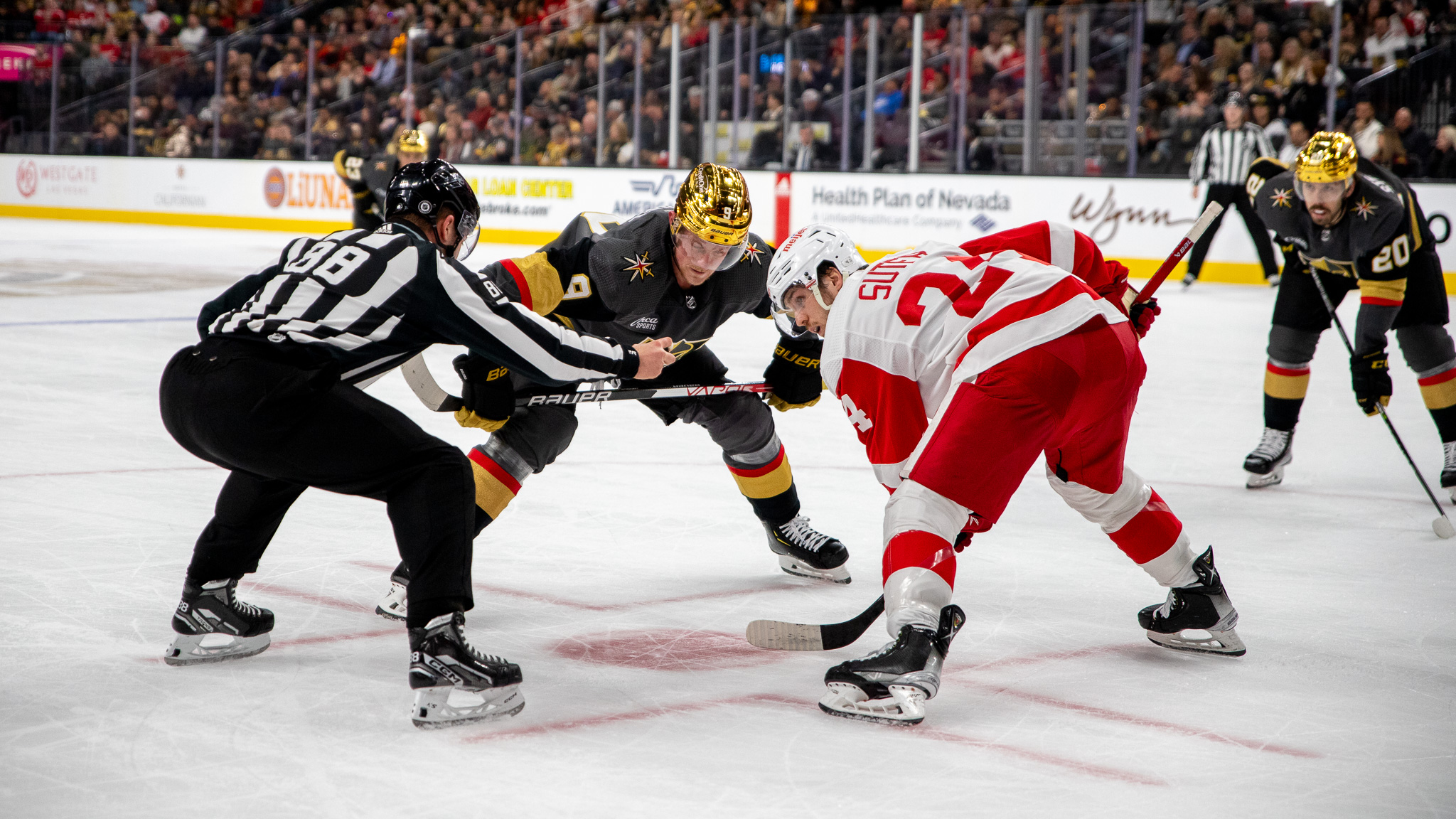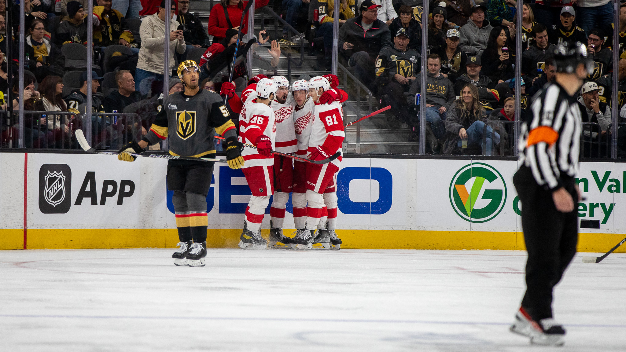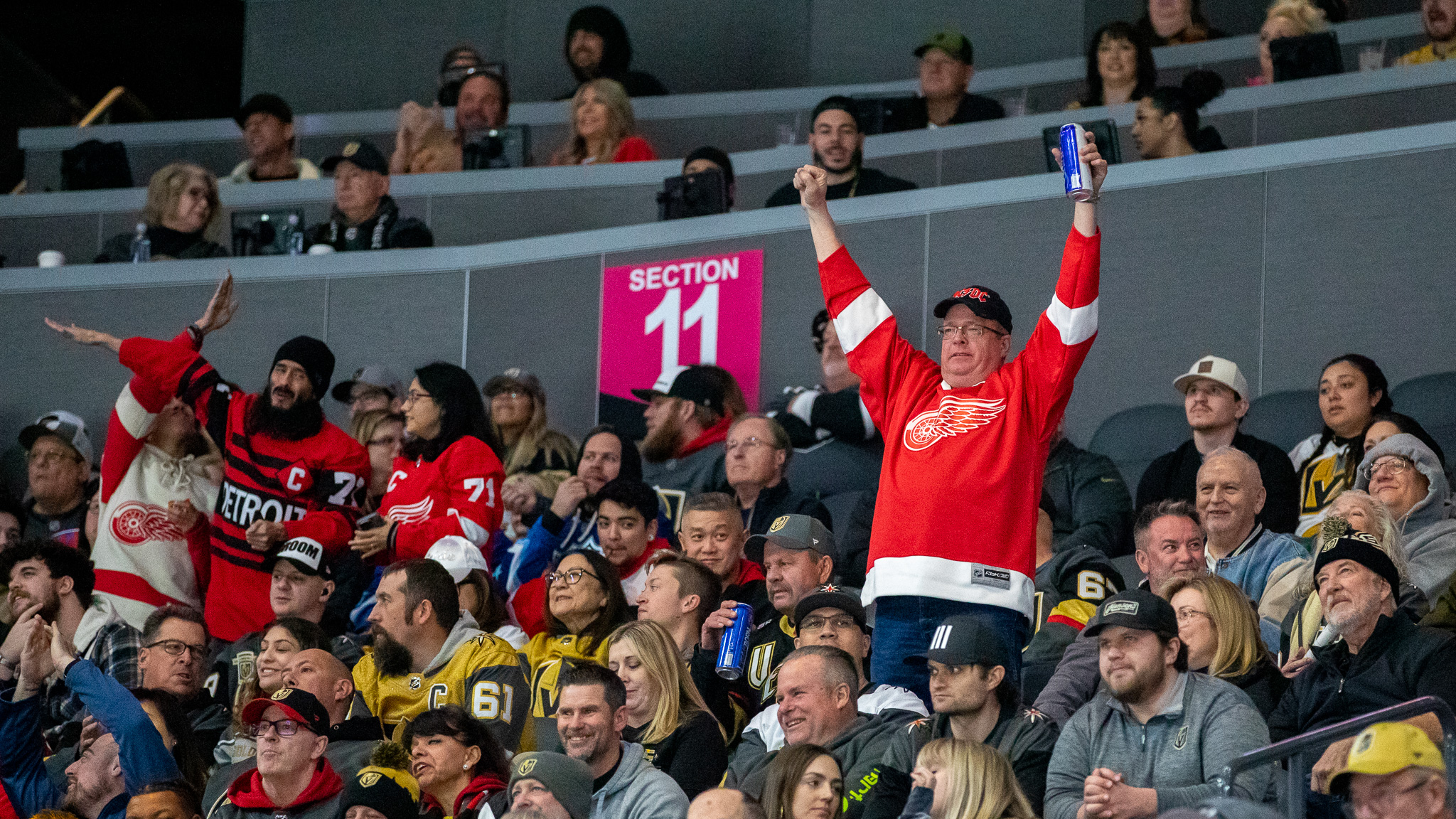 On Thursday, there were red jerseys scattered around T-Mobile Arena and chants of “Let’s Go Red Wings” competed with home team cheers of “Go Knights Go.”