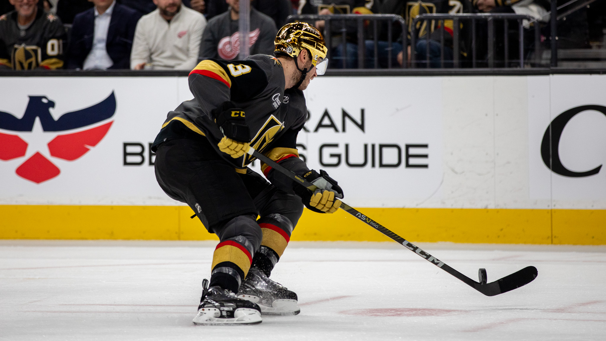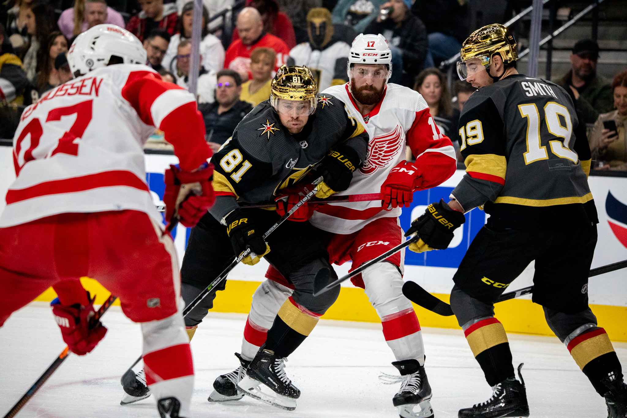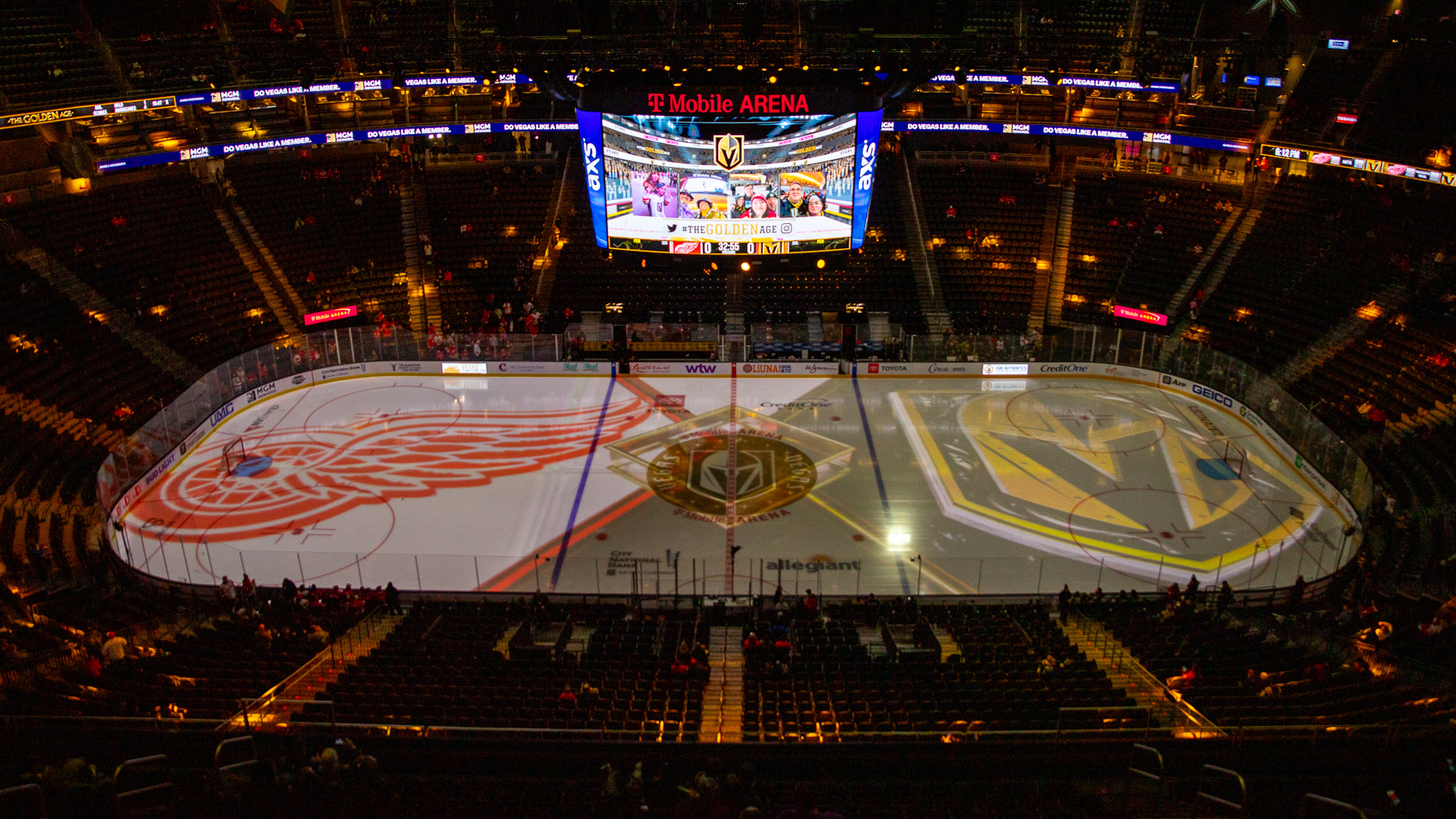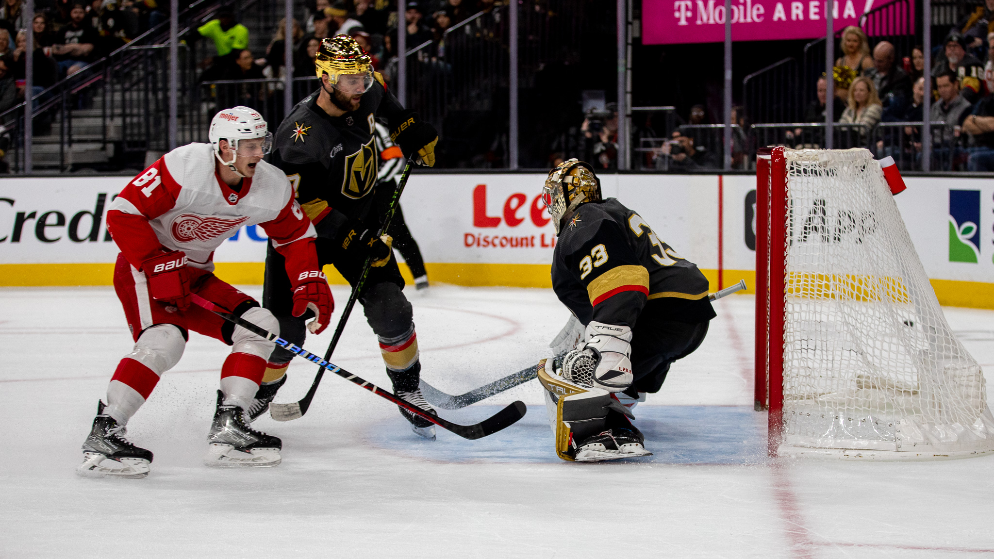 On Thursday, there were red jerseys scattered around T-Mobile Arena and chants of “Let’s Go Red Wings” competed with home team cheers of “Go Knights Go.”