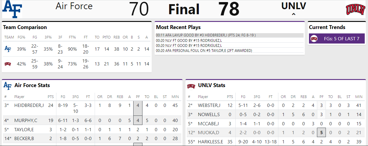 It was a one-man scoring show for UNLV, which relied on Elijah Harkless to register 35 points, while guard Justin Webster chipped in with a dozen points.