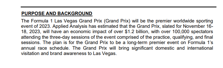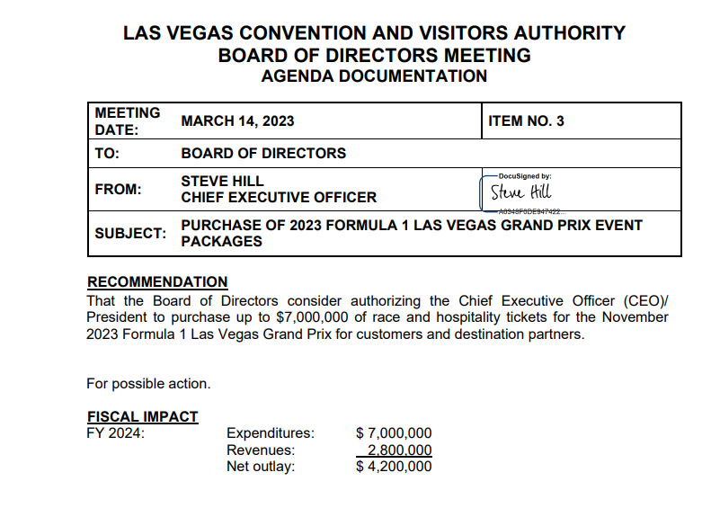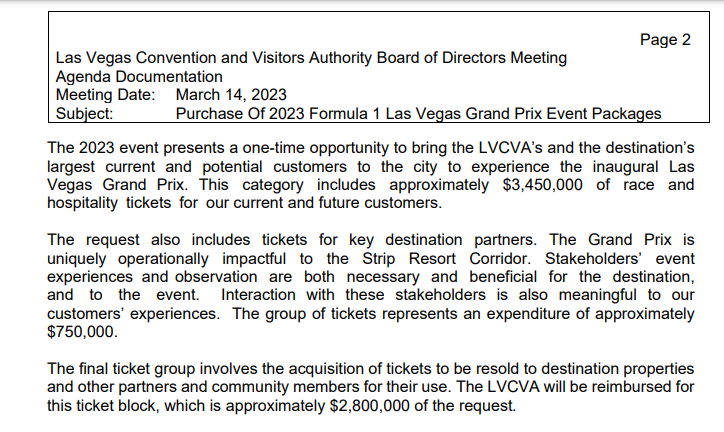 Here’s the way the LVCVA put the $7 million F1 ticket request on its agenda. Basically, it’s the same explanation the agency uses for all money it wants for sports — that it brings “visitation and brand awareness” to Las Vegas.