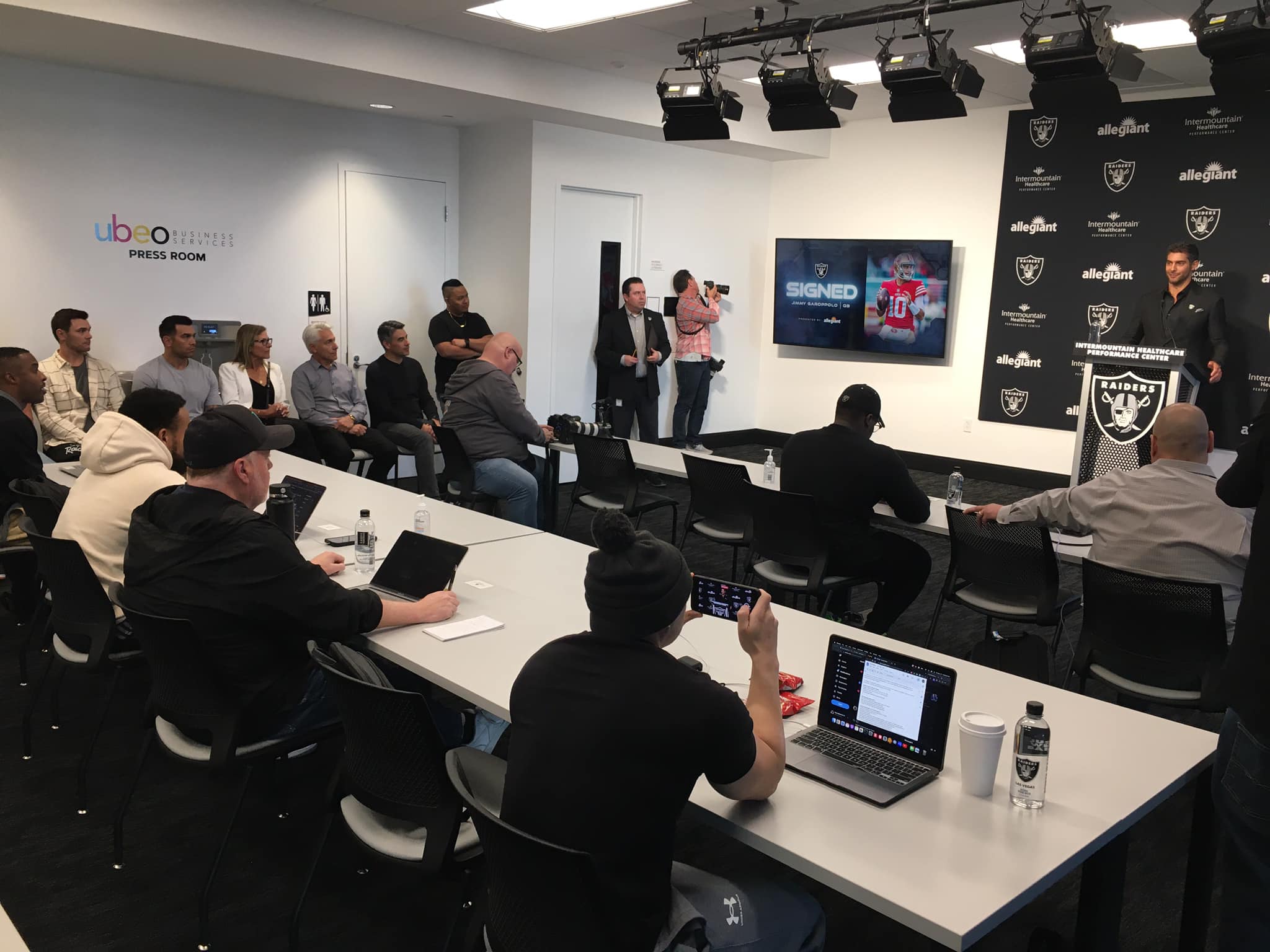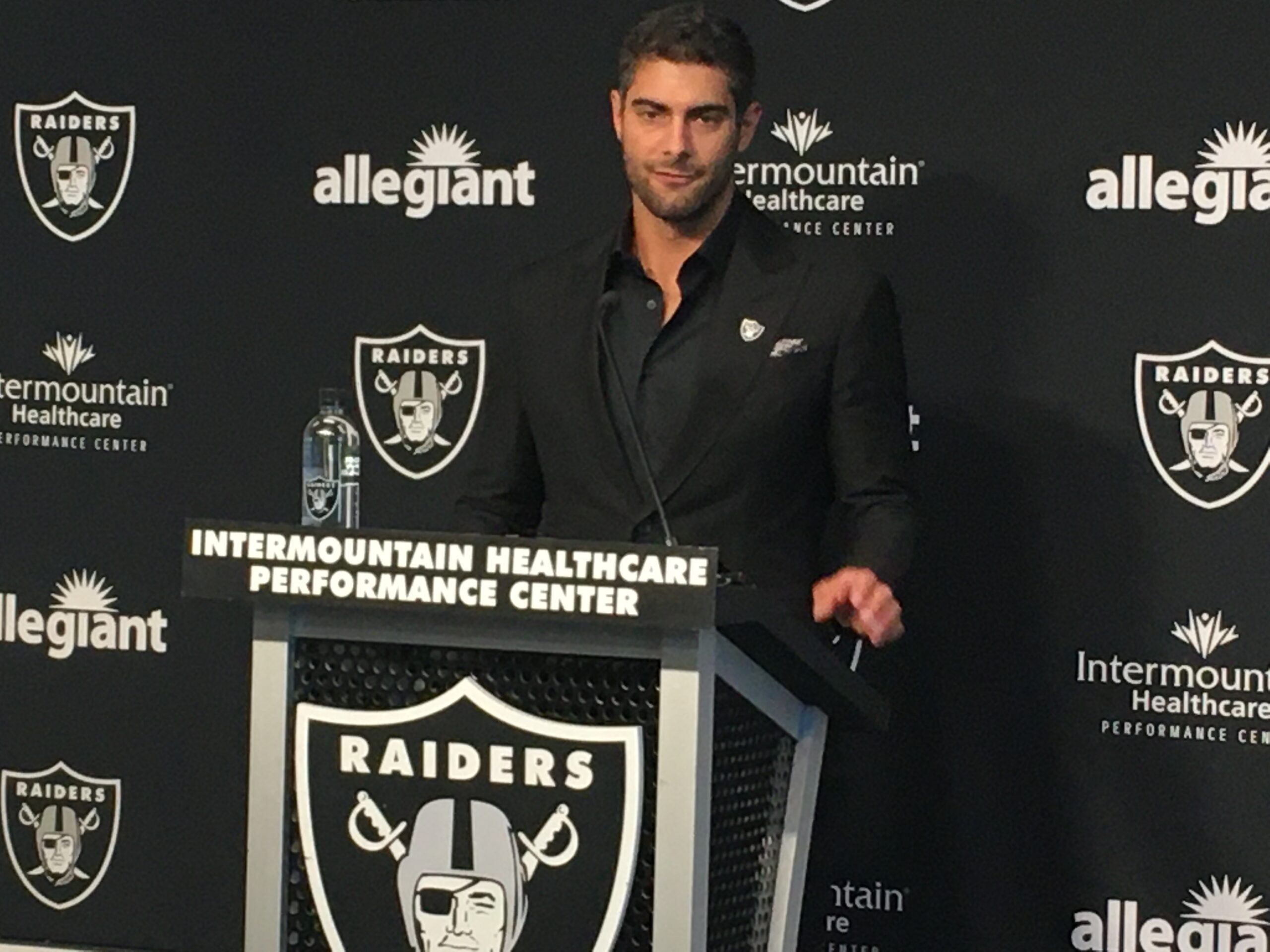 Jimmy Garoppolo, wearing a black suit and black shirt with his family sitting along the side of the Las Vegas Raiders media room, said all the right things during his Las Vegas introduction press conference at Raiders HQ in Henderson. Stuff like wanting to work hard, learning about Las Vegas and communicating with Raiders stars Davante Adams and Maxx Crosby.