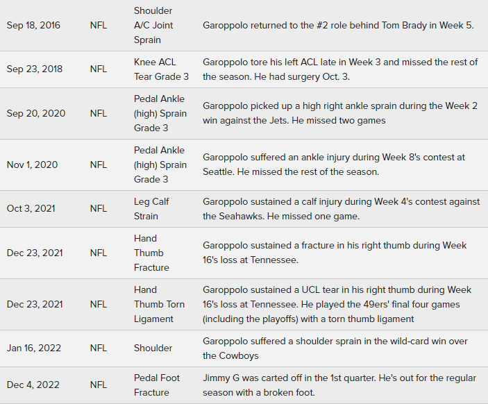 Draftsharks.com presented Garoppolo’s injury history in this graphic:
