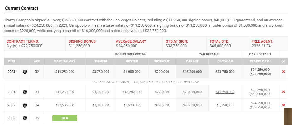 Garoppolo signed a $72,750,000 contract for three years, with a signing bonus of $11,250,000. Spotrac.com broke down the contract this way: