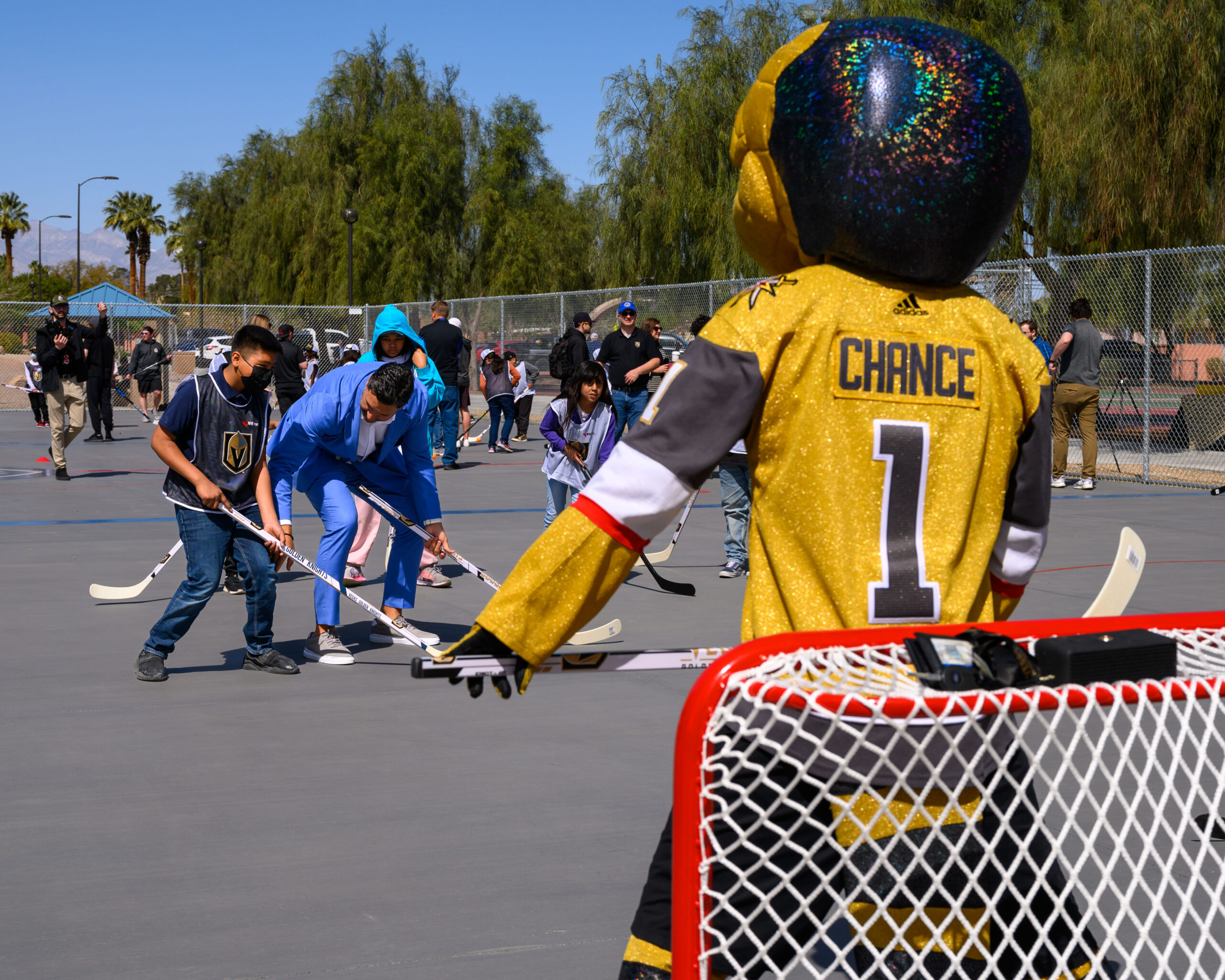So, the Vegas Golden Knights worked with the city of Las Vegas and the NHL to create a street hockey experience at Lorenzi Park at 3333 West Washington Avenue — a very different setting than the Golden Knights’ base in upscale suburban Summerlin.