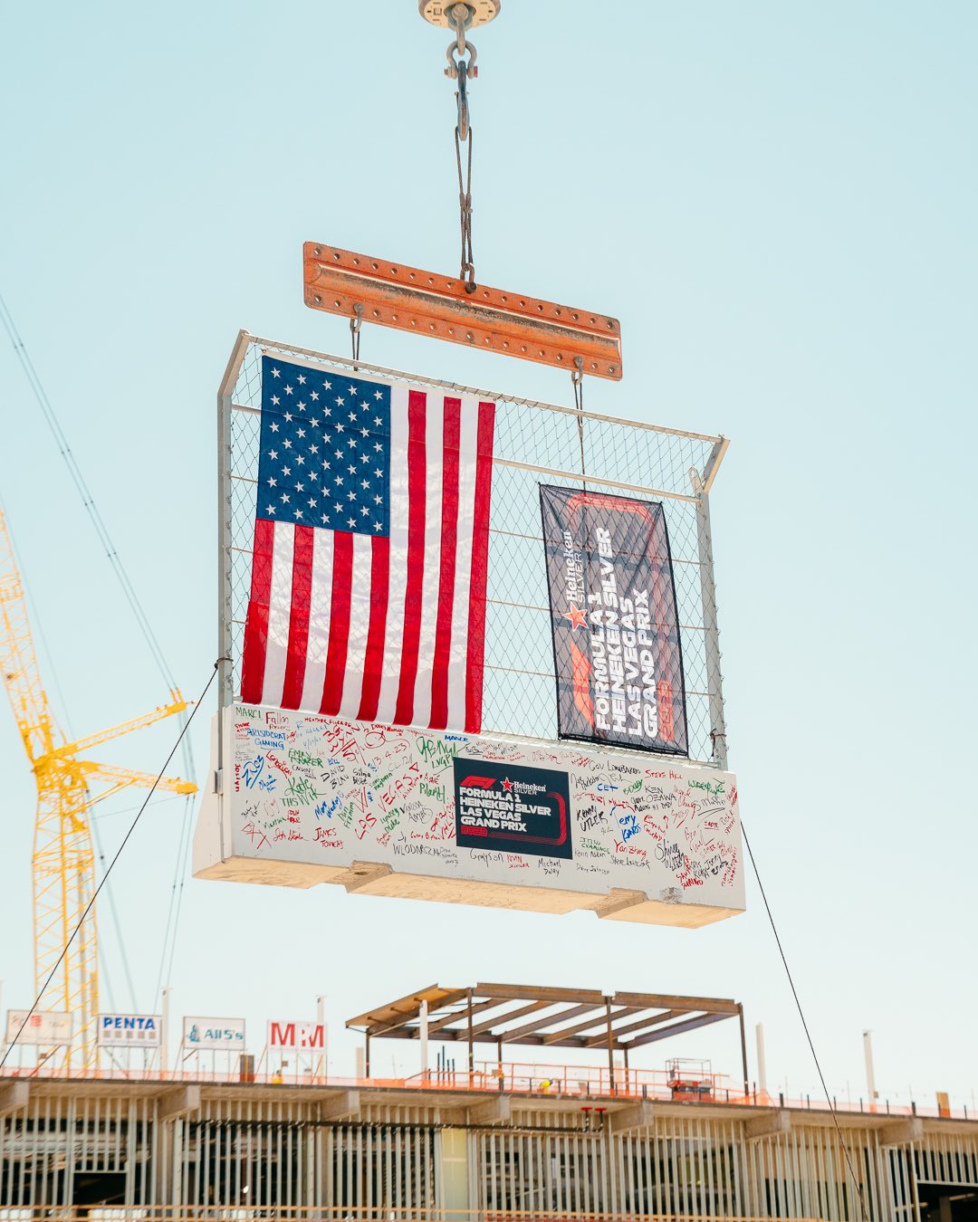 The F1 pit site will host the 300,000-square-foot race HQ. with suites and VIP amenities at the start and finish line. The topping out event celebrates the project’s final beam installation.