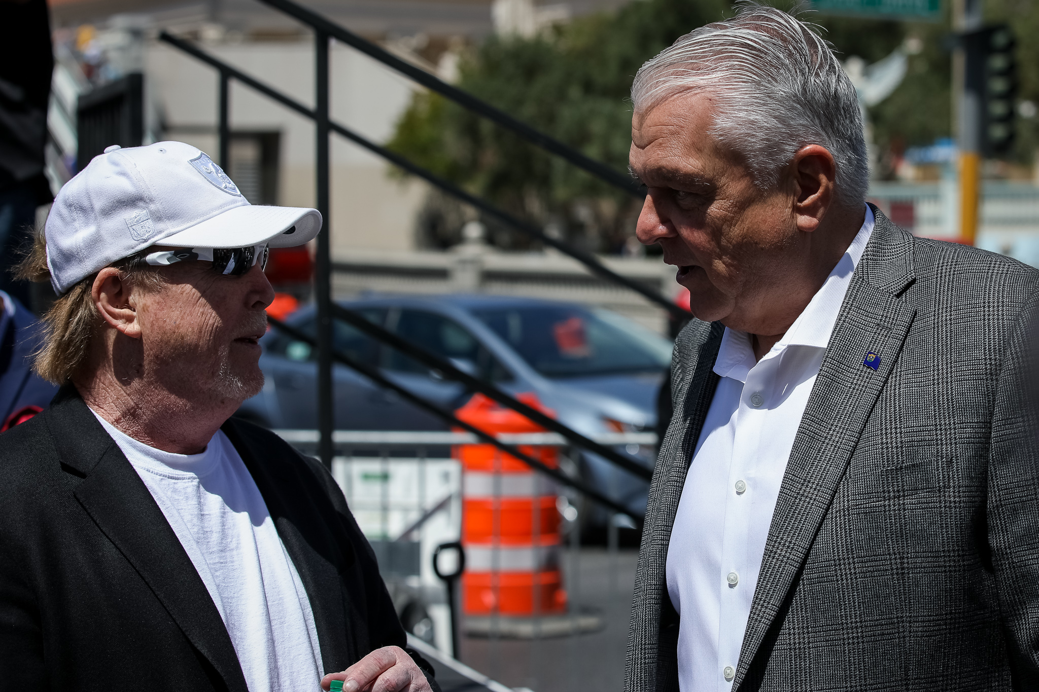 Raiders owner Mark Davis chatting with Gov. Steve Sisolak at the NFL Draft in Las Vegas a year ago. Photo credit: J. Tyge O’Donnell/LVSportsBiz.com
