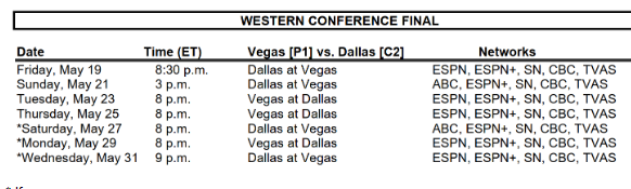After the Dallas Stars defeated the Seattle Kraken, 2-1, in Texas Monday, the National Hockey League released the WCF schedule. Take a look: