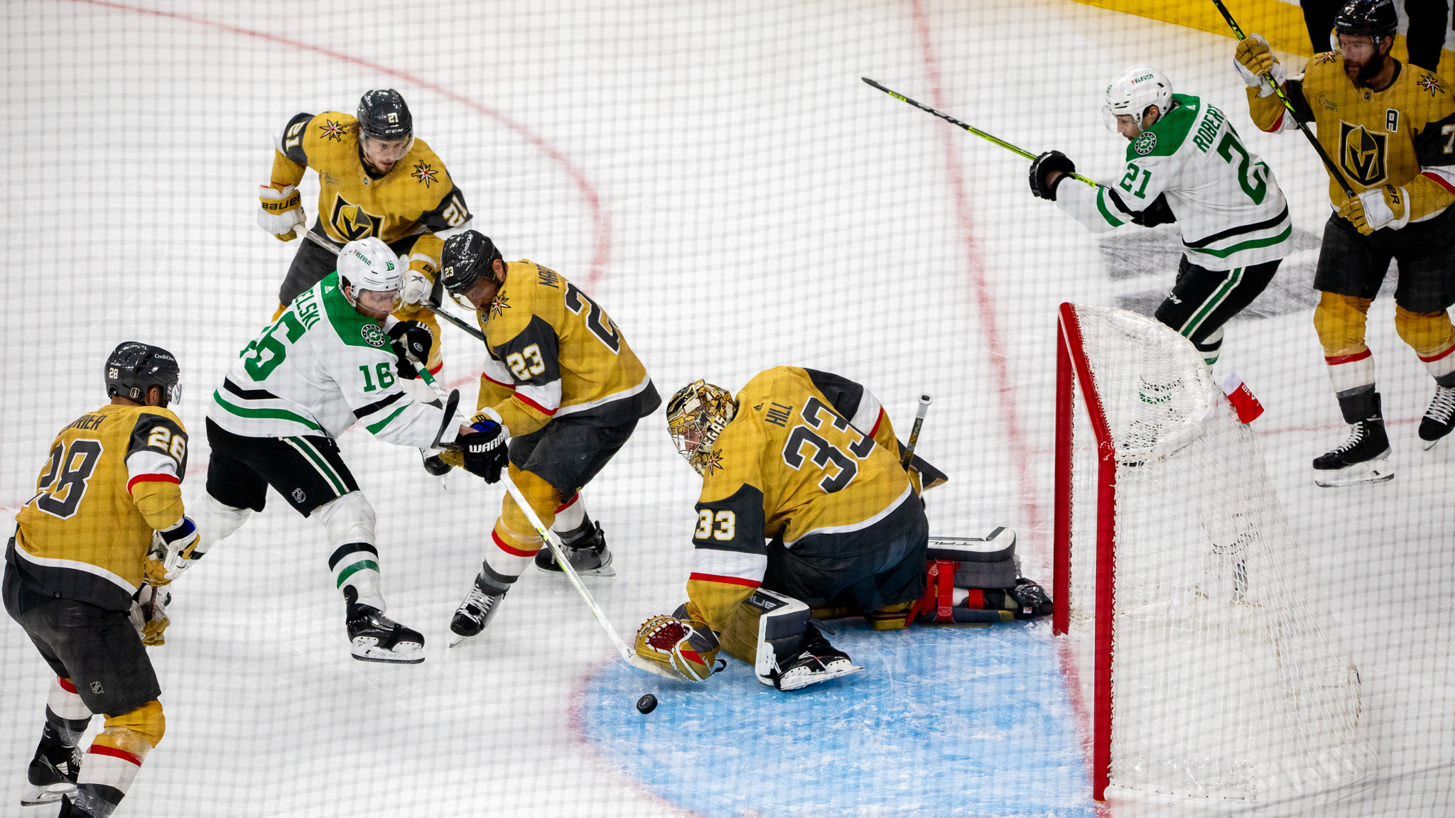 The Stars came right back to tie the game at two apiece following a score by Jason Robertson, who flipped the puck over Hill’s shoulder and into the net.
