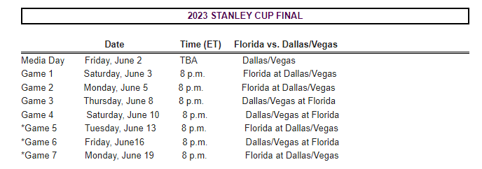 The NHL issued the Stanley Cup Final schedule, with the winner of the Dallas/Vegas conference final hosting the upstart Florida Panthers, champs of the Eastern Conference. Here’s how the schedule looks.