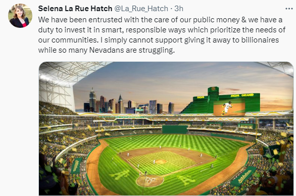 Joining Hill in presenting the case to subsidize the $1.5 billion A’s ballpark with $380 million in government assistance were Athletics consultant Jeremy Aguero, a Las Vegas-based consultant who works for the LVCVA and talks frequently about the Las Vegas sports industry’s growth, and state Treasurer Zach Conine, who was so effusive for his support of the stadium bill during Monday’s hearing that it was unclear whether he worked for the people of Nevada or the Athletics ballclub.