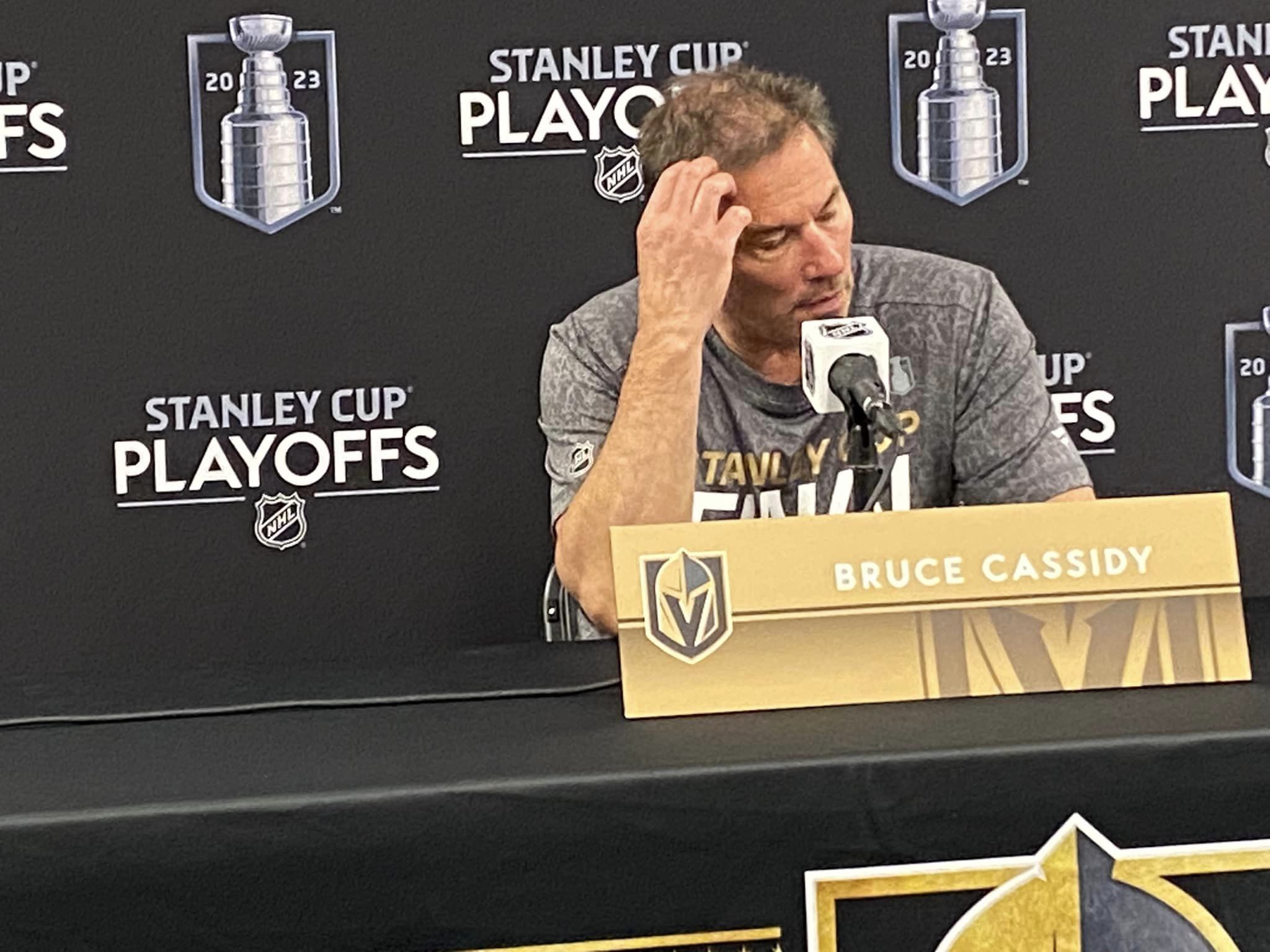 Golden Knights coach Bruce “Butch” Cassidy, in his first year as VGK coach, touched on the raucous atmosphere as part of the VGK brand. He didn’t mind how open the practices are to the public and Thursday’s 11 AM drills session at City National Arena brought back memories of the big crowds that filled the practice rink five years ago when the VGK played Washington in the 2018 SCF won by the Caps.