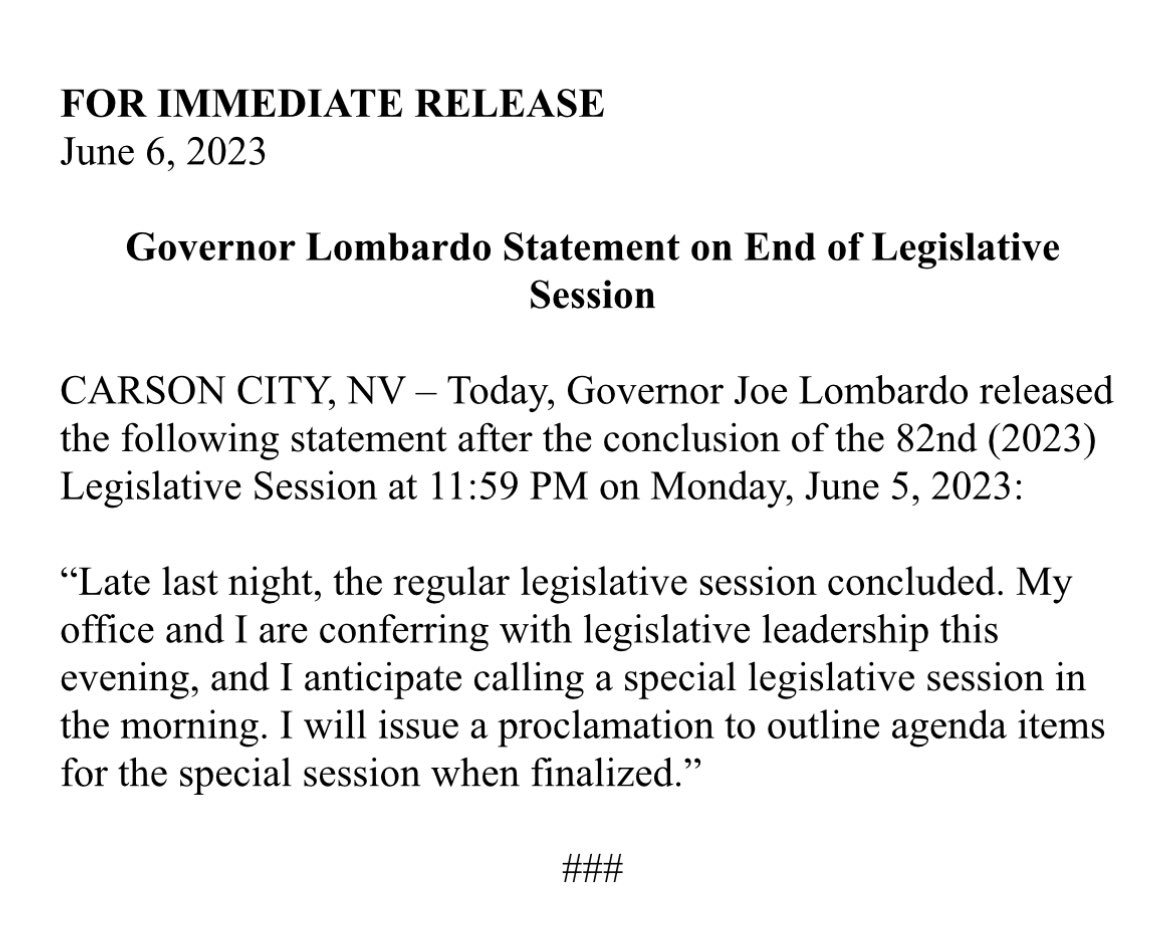 But Gov. Joe Lombardo has opened the door to a special session. This appeared on social media: