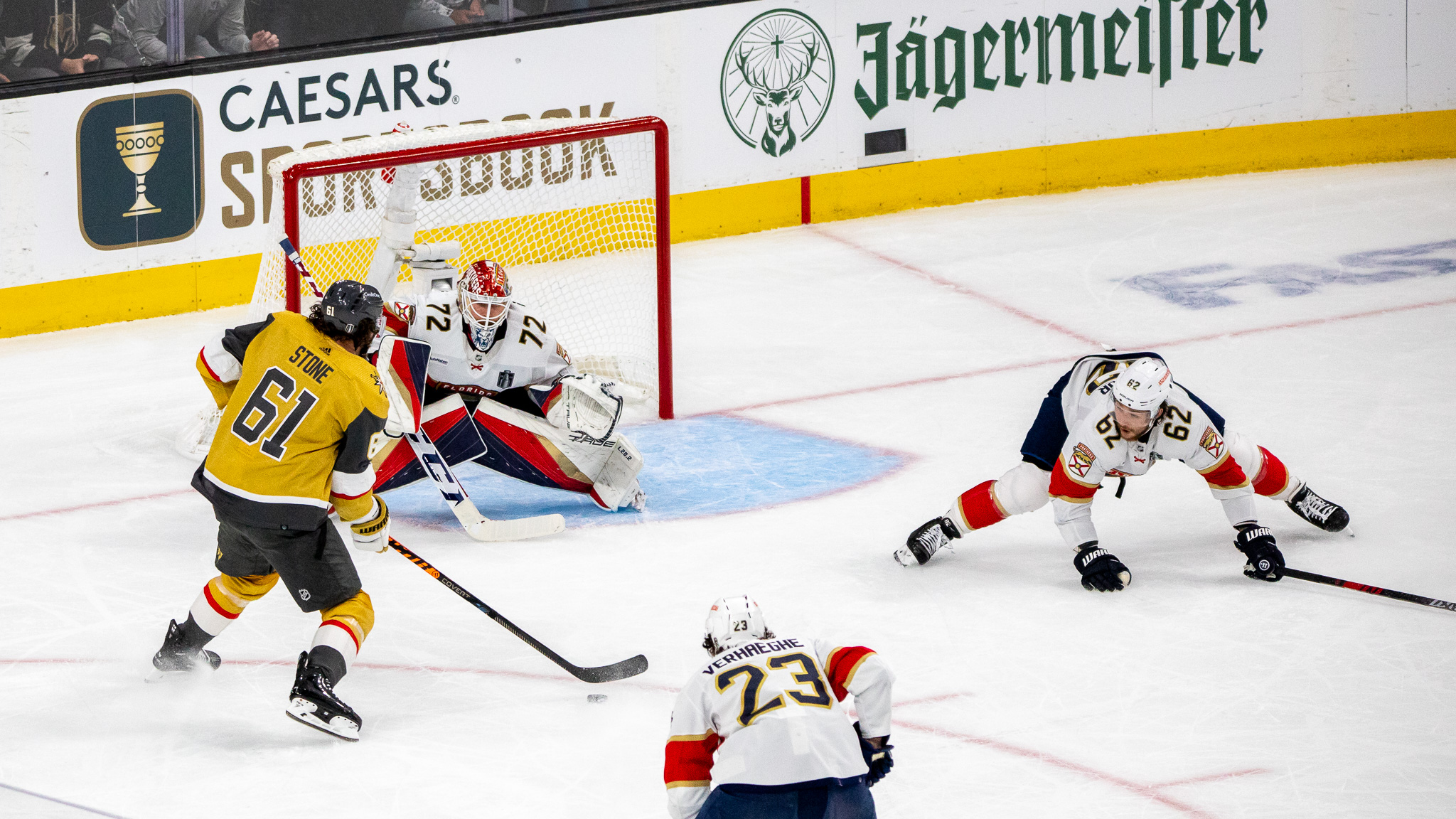 The Golden Knights jumped to a 1-0 lead after Hill made an exquisite save after some fine Panthers passing on their power play. Stone then grabbed the puck on the left side, skated about half the length of the ice and beat Florida goalie Sergei Bobrovsky from in close for a short-handed tally.